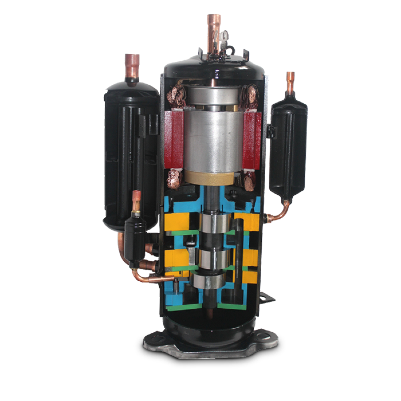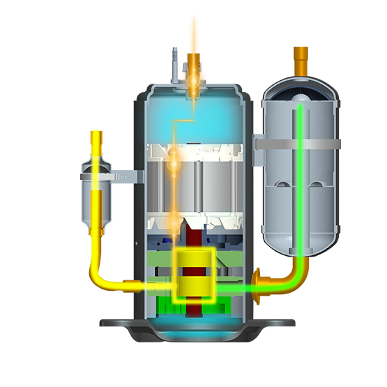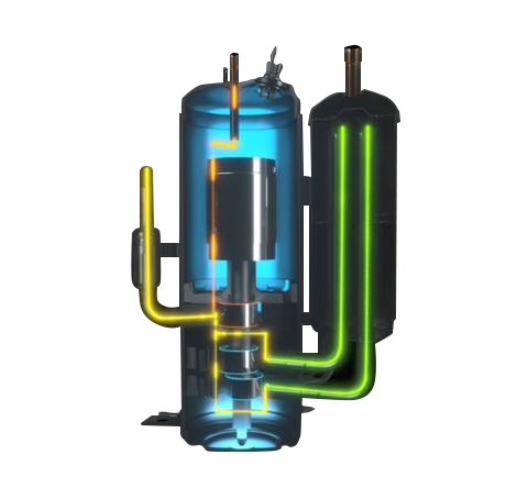 三缸雙級(jí)變?nèi)莘e比壓縮機(jī)可實(shí)現(xiàn)兩種不同容積比的雙級(jí)壓縮,可降低單個(gè)氣缸的壓縮比,減小了泄漏量,提高了壓縮機(jī)的容積效率,與單級(jí)壓縮系統(tǒng)相比,雙級(jí)增焓壓縮系統(tǒng)具有能力高、能效高和可靠性高的優(yōu)勢(shì),使用在家用熱泵空調(diào)、多聯(lián)式熱泵空調(diào)、戶(hù)用冷水熱泵機(jī)組等多種類(lèi)型的熱泵產(chǎn)品中。