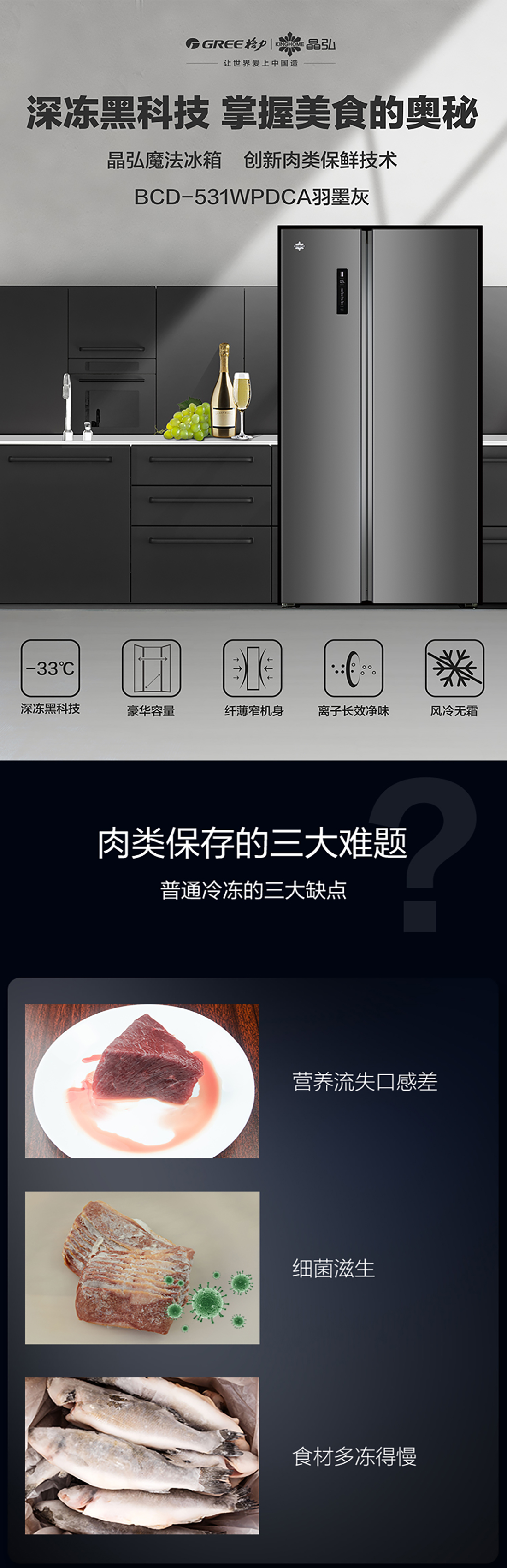 搭載-33℃深凍鎖鮮科技,肉汁飽滿更長(zhǎng)久。采用離子長(zhǎng)效抗菌凈味,抗菌率高達(dá)99.9%。風(fēng)冷無霜,拒絕風(fēng)干,食材水潤(rùn)新鮮。