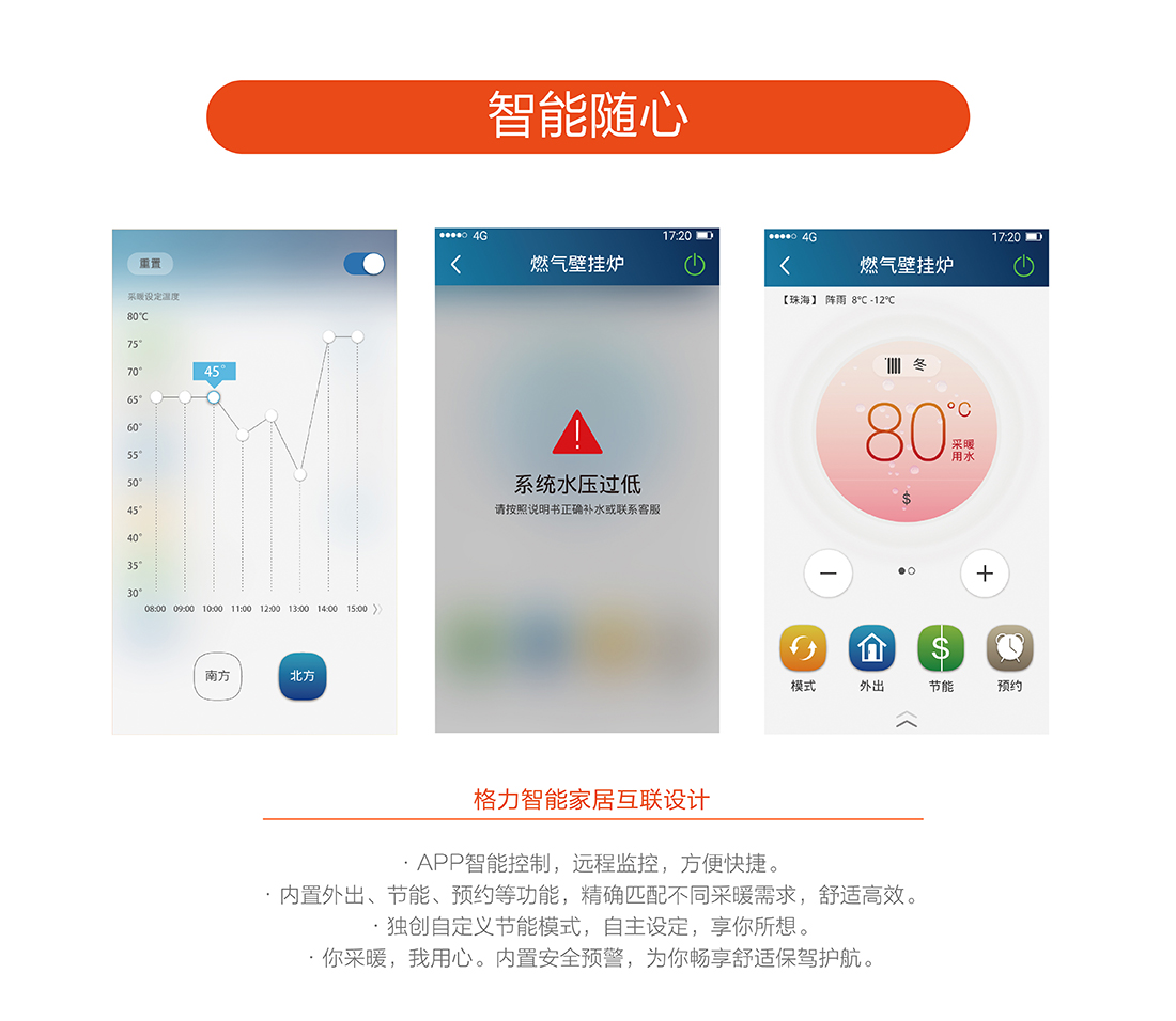 充分燃燒效率達到90%以上,采用智能水溫調節,快速出熱水,減少水流浪費,恒溫±0.5℃以內精確控制,生活水溫度35-60℃,采暖水溫30-80℃。