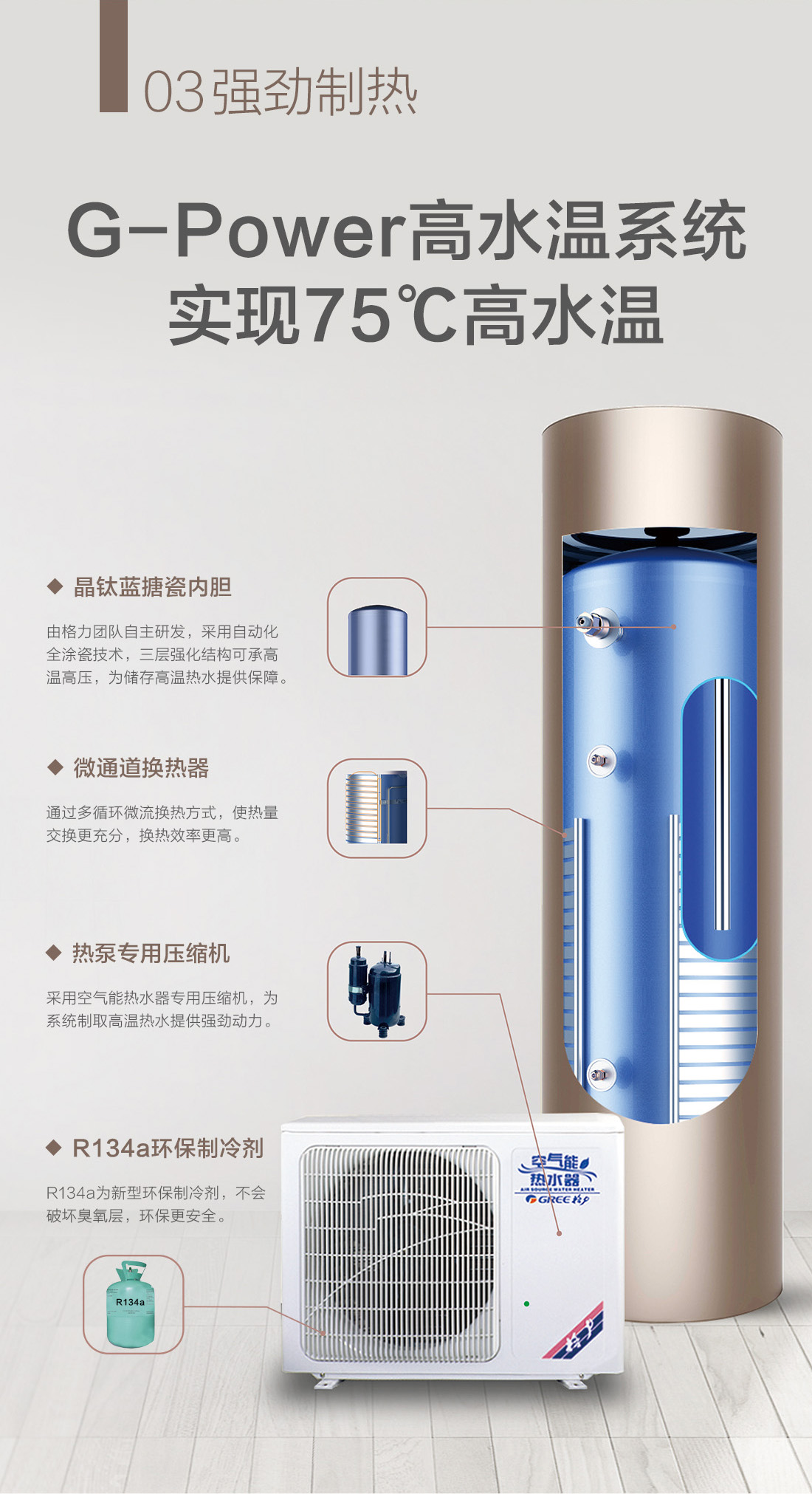 高溫大水量,沐浴暢快享,搭載G-power高水溫系統(tǒng),成就水溫更高,水量更大的空氣能熱水器,更達1級能效,省電高達75%,全家人暢快享受的沐浴選擇。